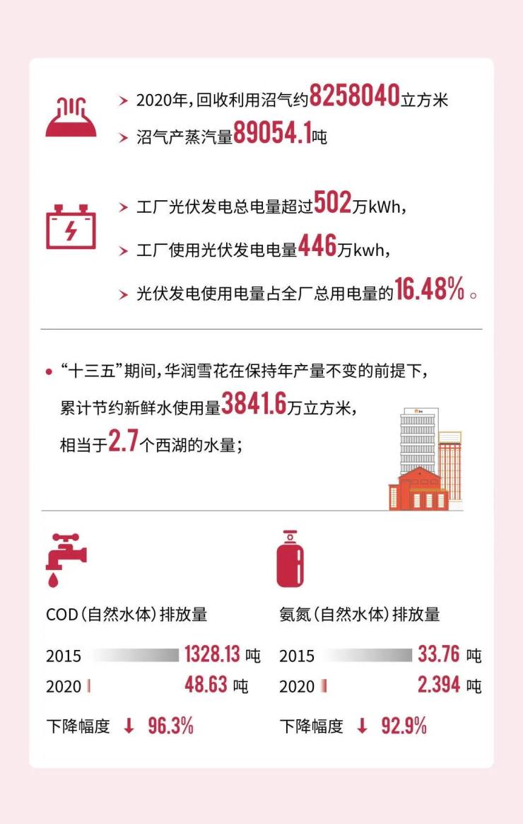 2021年6月,华润雪花啤酒(中国)有限公司发布2020年度社会责任报告,这是雪花连续发布的第八份年度社会责任报告,并连续三次获得全球报告组织(GRI)认证。“十三五”期间,华润雪花啤酒累计能源节约量为20.83万吨标准煤,减少碳排放12.4万吨;二氧化碳排放量同比“十二五”期间减少40%,二氧化硫排放量同比下降85.3%,氮氧化物排放量同比下降75.4%。在助力国家“3060”双碳目标方面,华润雪花啤酒致力于成为低碳转型的先锋企业。