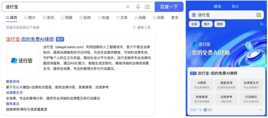 目前,法行宝PC端和移动端搜索均已上线,上百度搜“法行宝”,马上向您的免费AI律师提问吧!
